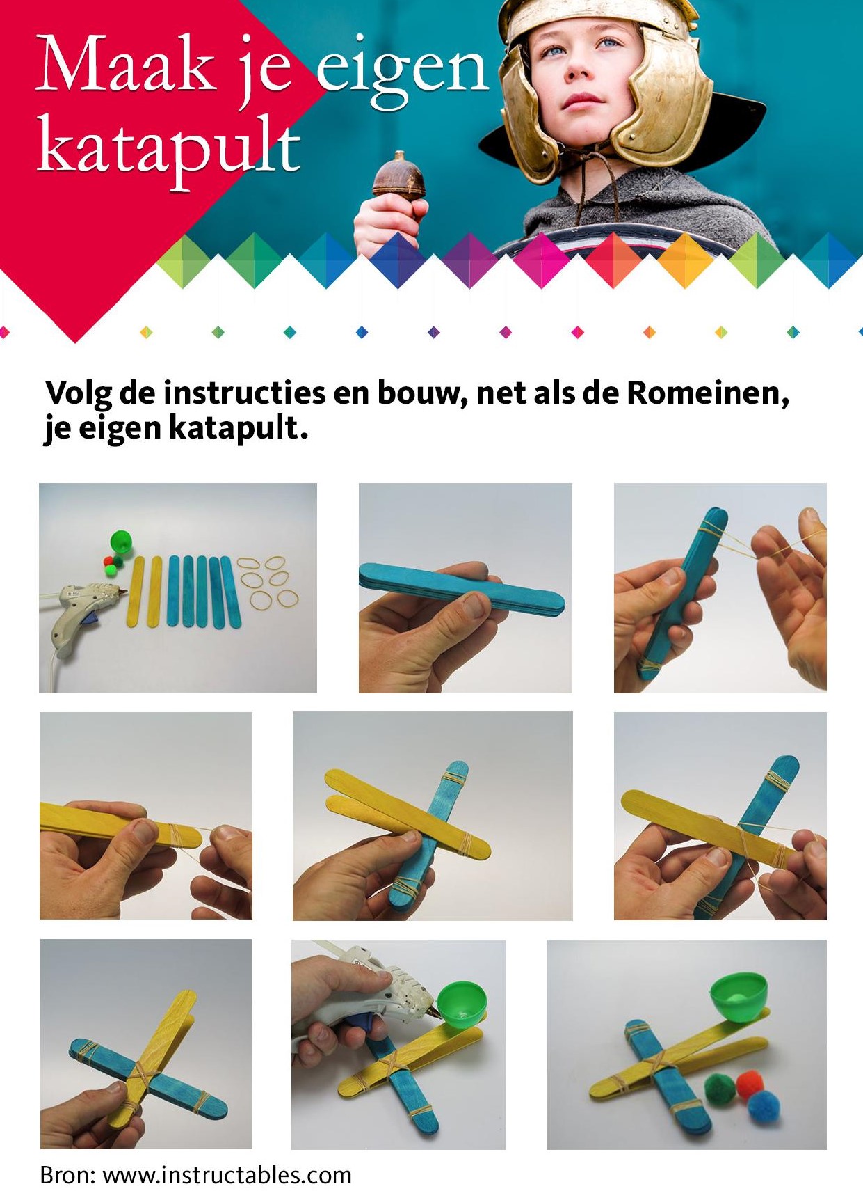 Romeinse soldaten veroverden half Europa. Hun legers waren waren voor die tijd modern. Ze gebruikten bijvoorbeeld enorme katapulten. Met een paar simpele materialen kun je zelf zo’n katapult bouwen – in het klein natuurlijk. Je hebt 7 ijsstokjes nodig, 6 elastiekjes, een dopje van een fles en een balletje dat niet te zwaar is. De instructie staat hier.