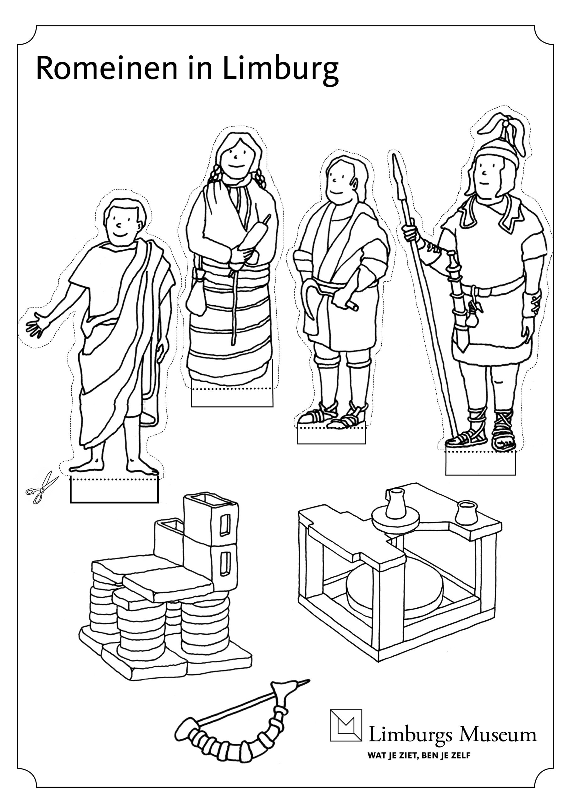 Op de kleurplaat zie je vier Romeinse figuren: een militair, een burger, een ambachtsman en een vrouw die zelf geen Romeinse is maar wel de Romeinse gebruiken heeft overgenomen. Je ziet ook een pottenbakkersoven, een mantelspeld en vloerverwarming uit de Romeinse tijd.