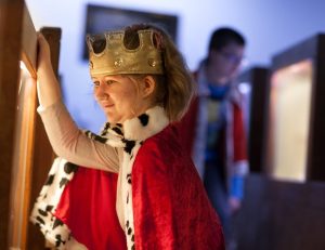 De museumdocent ontvangt de leerlingen in het museumtheater. Ze krijgen verkleedkleren die horen bij een middeleeuwse rol. Zo zijn er kooplieden, boeren (horigen), ridders, jonkvrouwen en een jonkheer. Een leergesprek en een film bereidt de leerlingen voor op het bezoek aan de museumzaal.